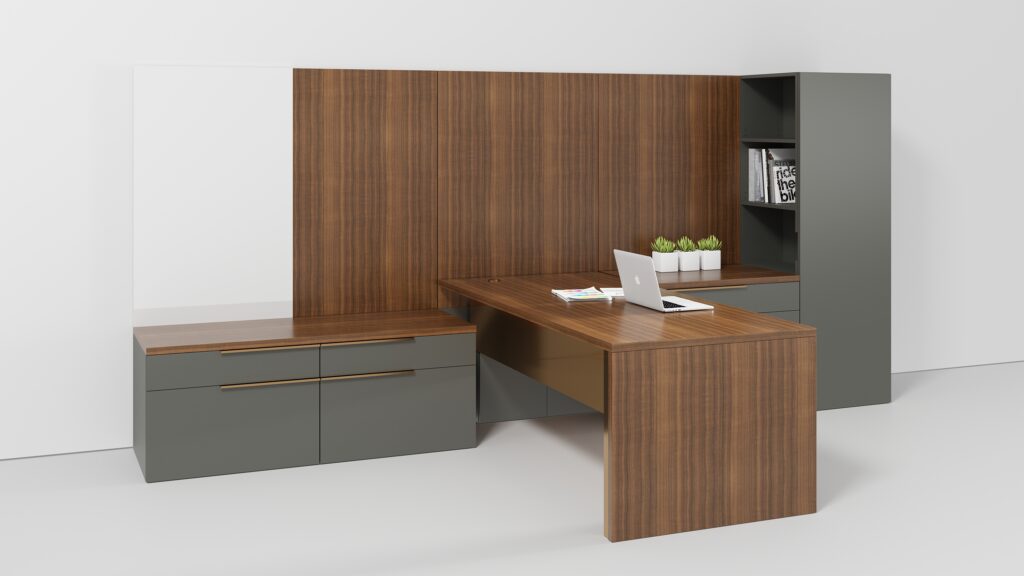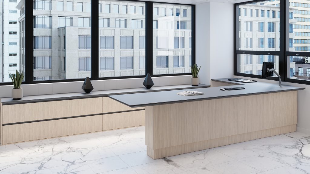 L-shaped height adjustable desk and return with rear file storage units. Veneer case with Fenix laminate tops.