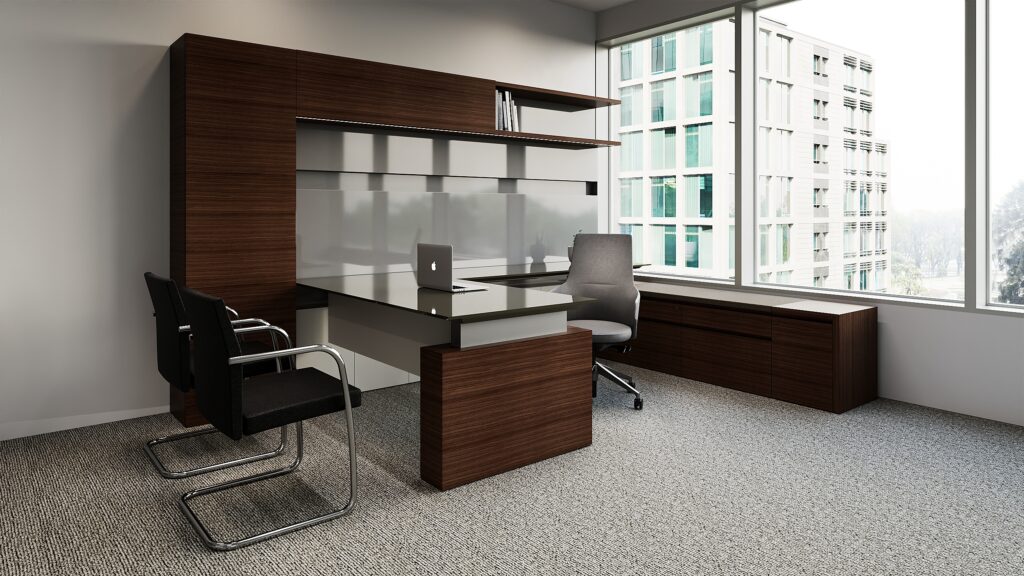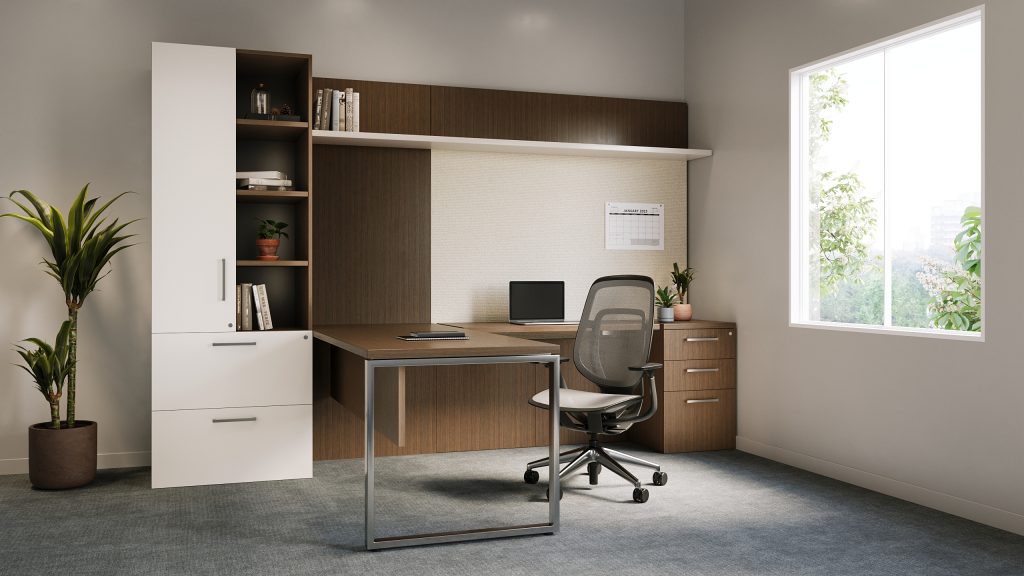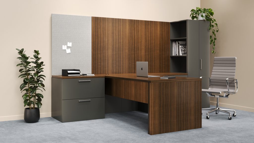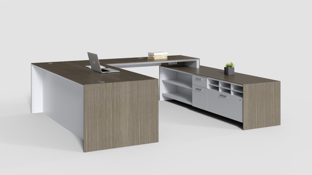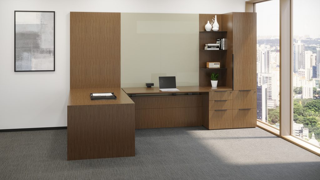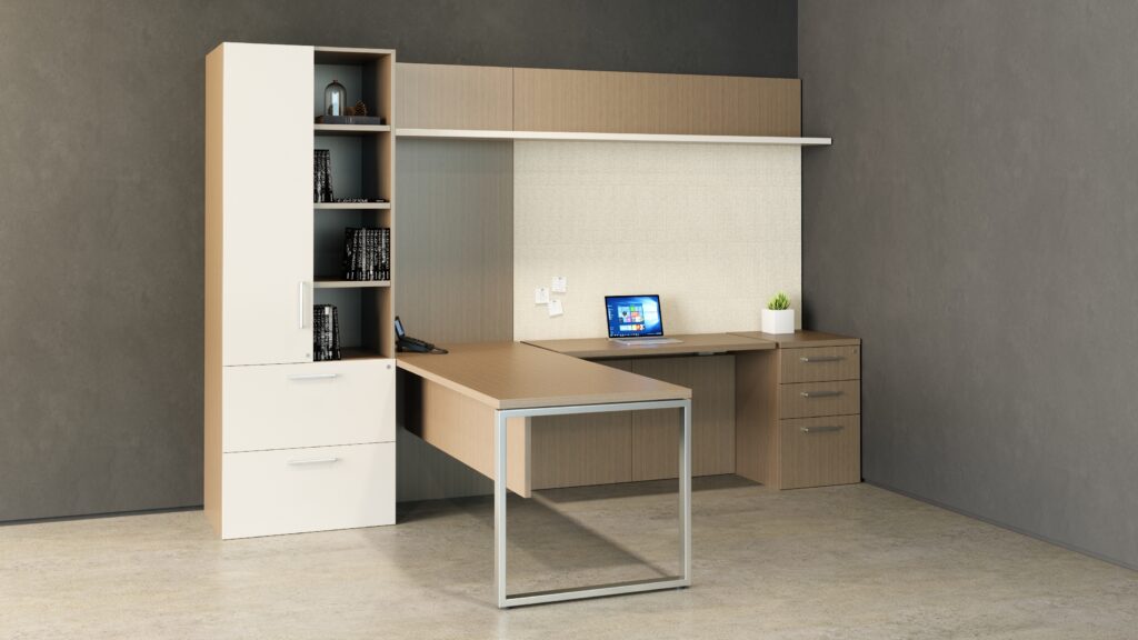 U shaped office with L-shaped height adjustable work surface.
