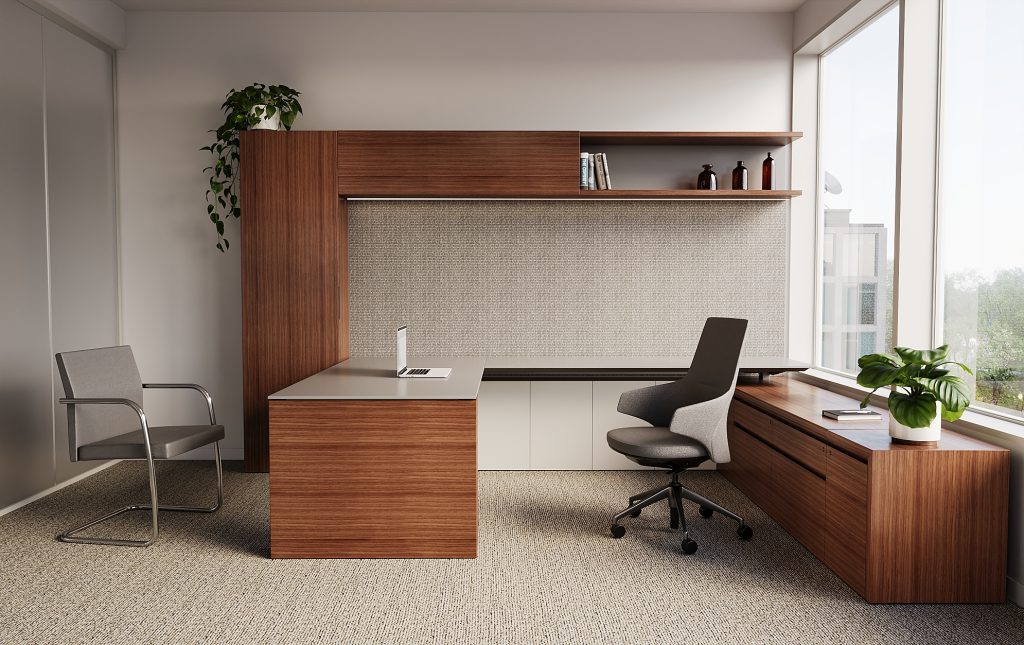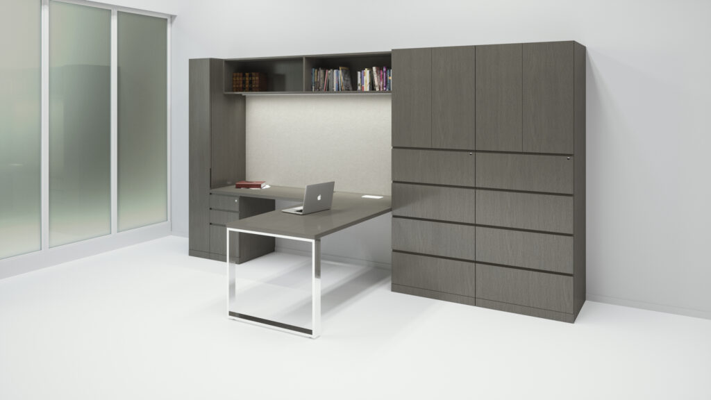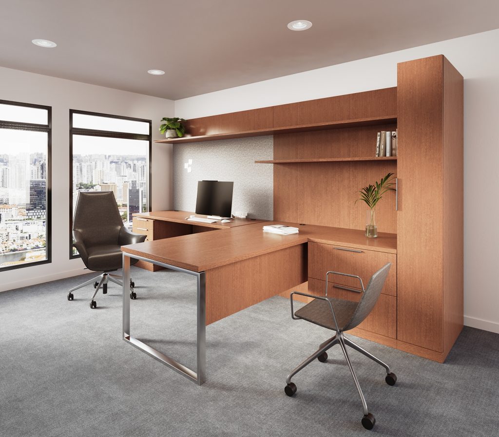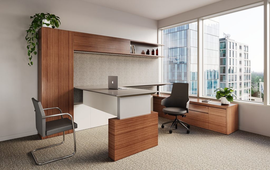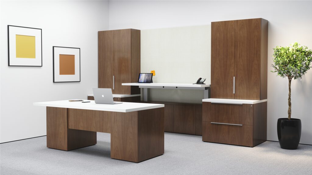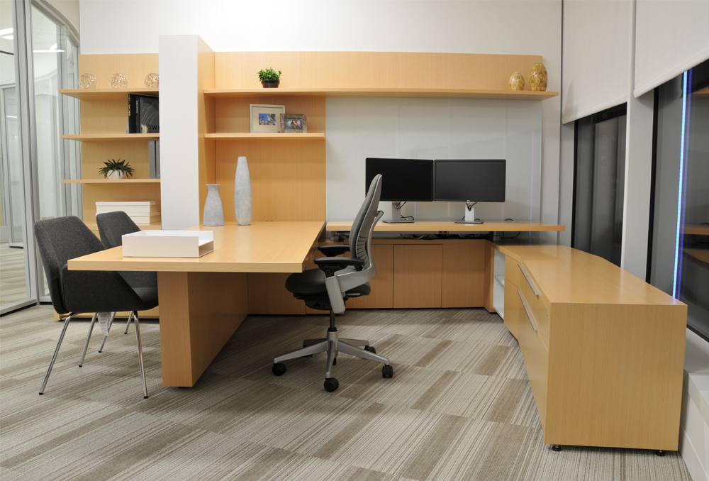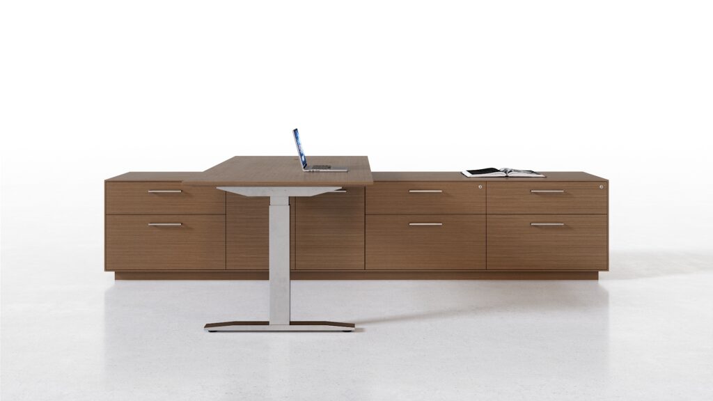 Height adjustable work surface, veneer tops, painted fronts. Office includes matching oval meeting table (not pictured).