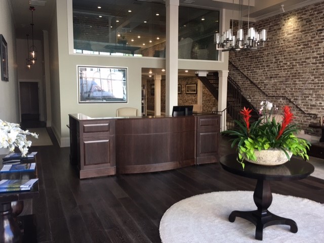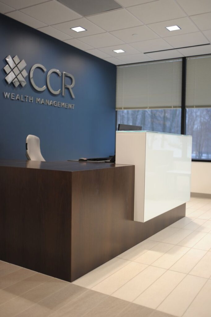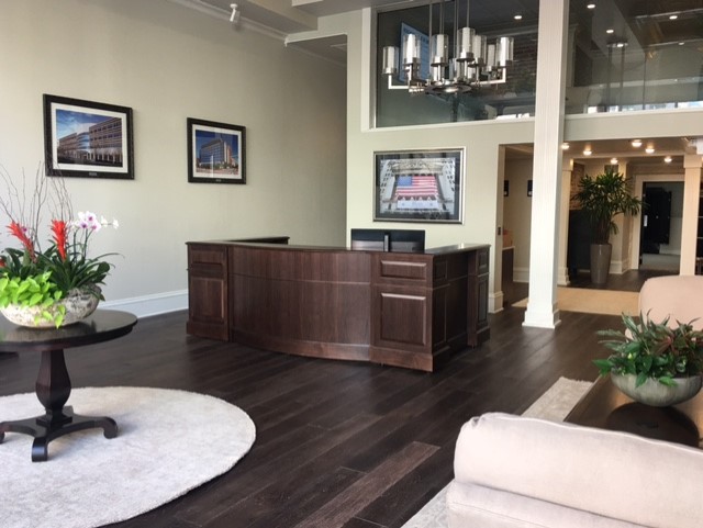 Painted desk w/ walnut transaction front and Carrara marble surround.