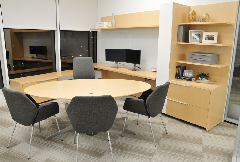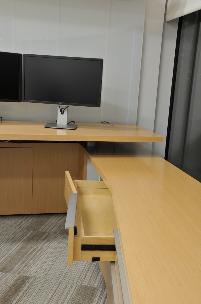 Other unique features include truncated credenzas built to coincide with angles of the building exterior walls and a custom base for oval tables with integral wire chase for discreet power conveyance. Bespoke veneer walls and credenza shrouds in matching Linea veneer have been applied to existing furniture to maintain a cohesive aesthetic throughout the office.