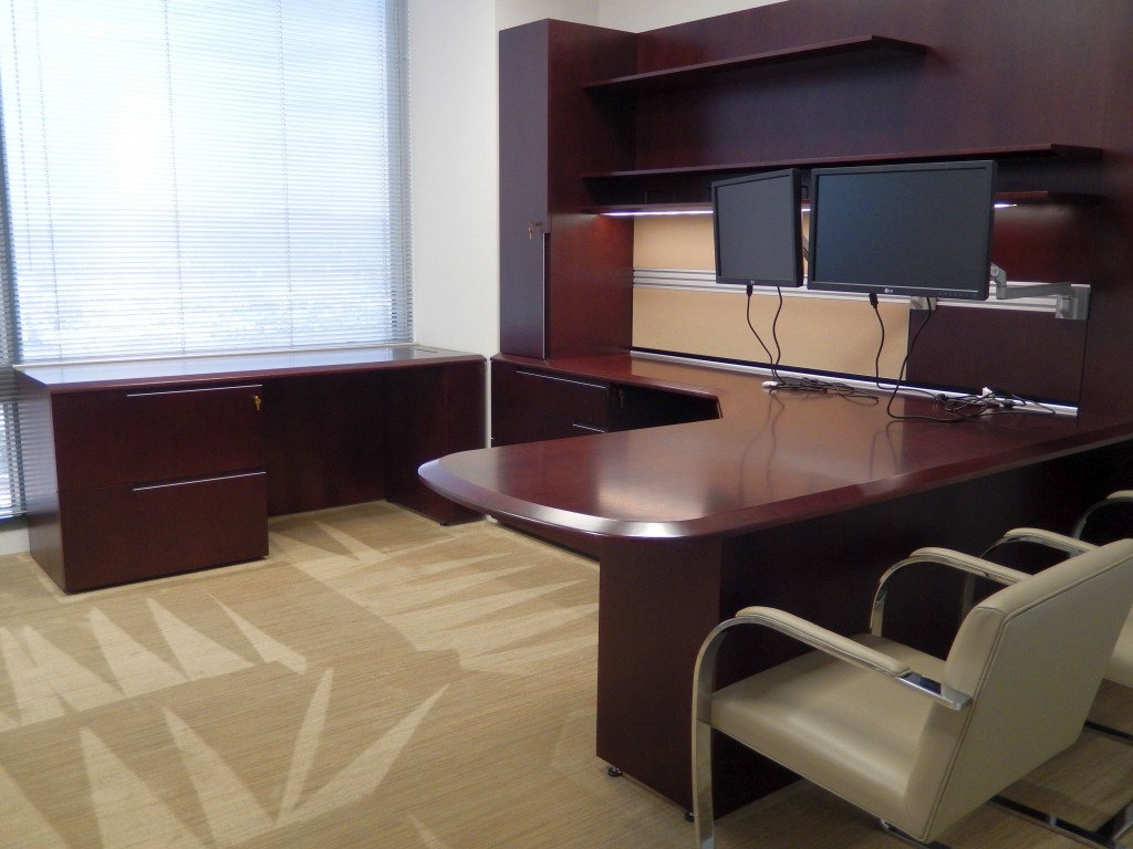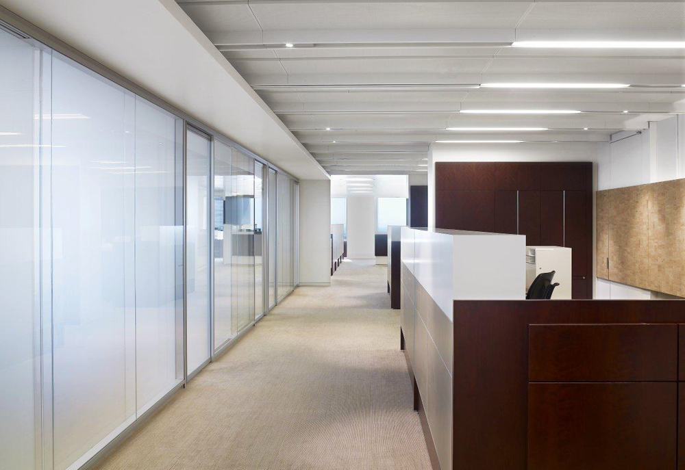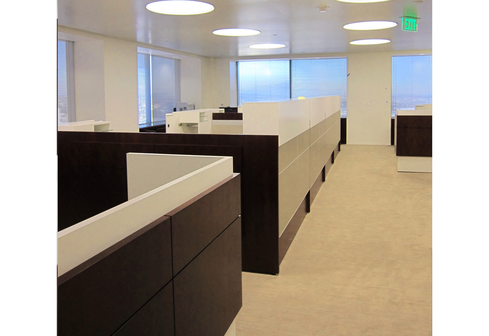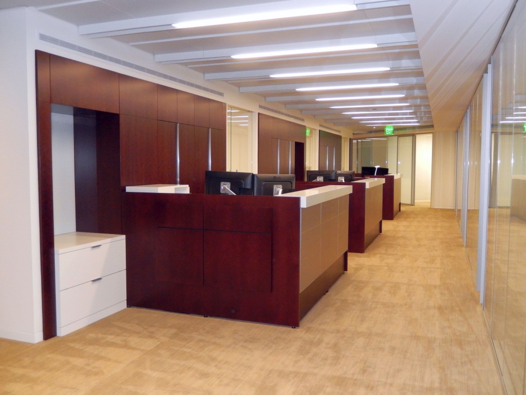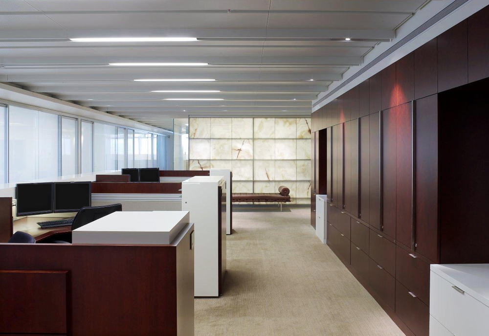 The multi-floor plan of the Los Angeles based investment group Oaktree Capital includes 36 bespoke private offices and 58 administrative assistant stations. With an eye for high design, the spaces all incorporate high-contrasting materials and are detailed to coordinate with site specific millwork. Flat-cut cherry veneer finished in a deep claret was used in combination with brilliant white elements and putty Spinneybeck leather tile panels to create an elegant yet approachable work space.
