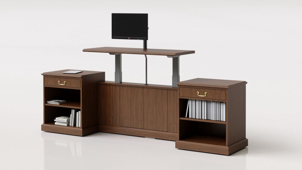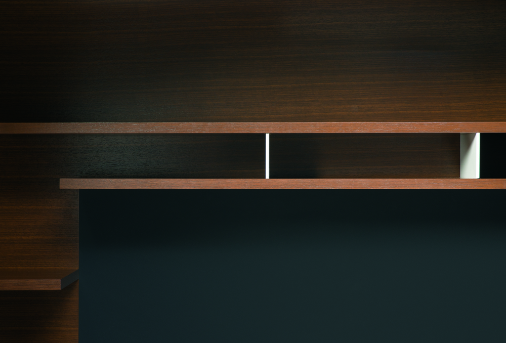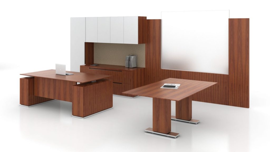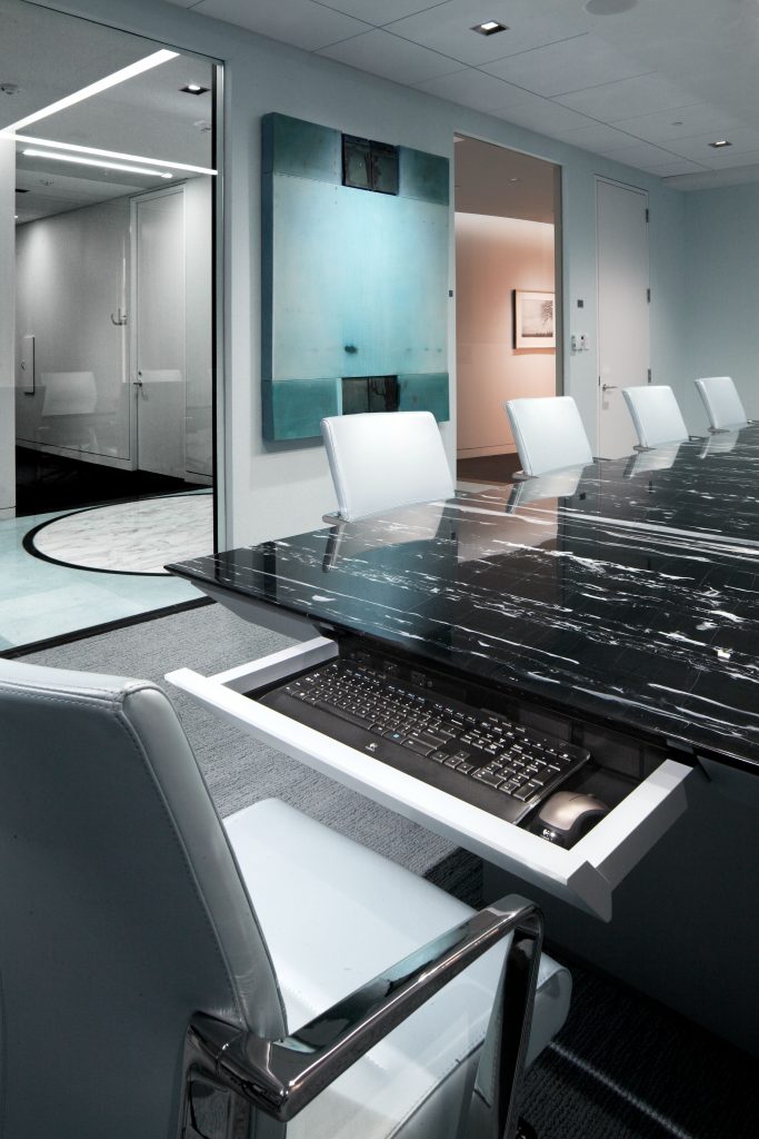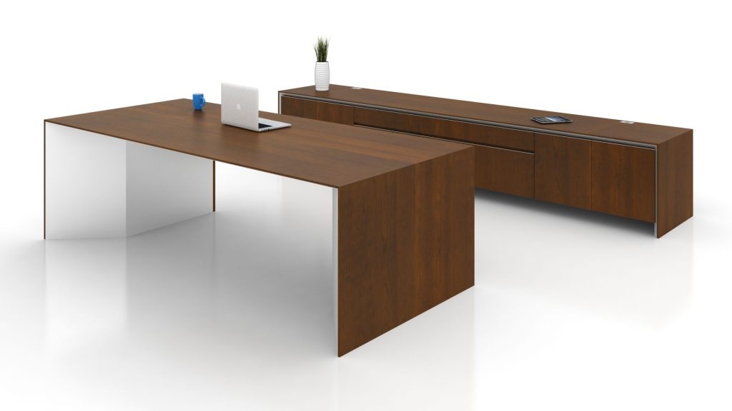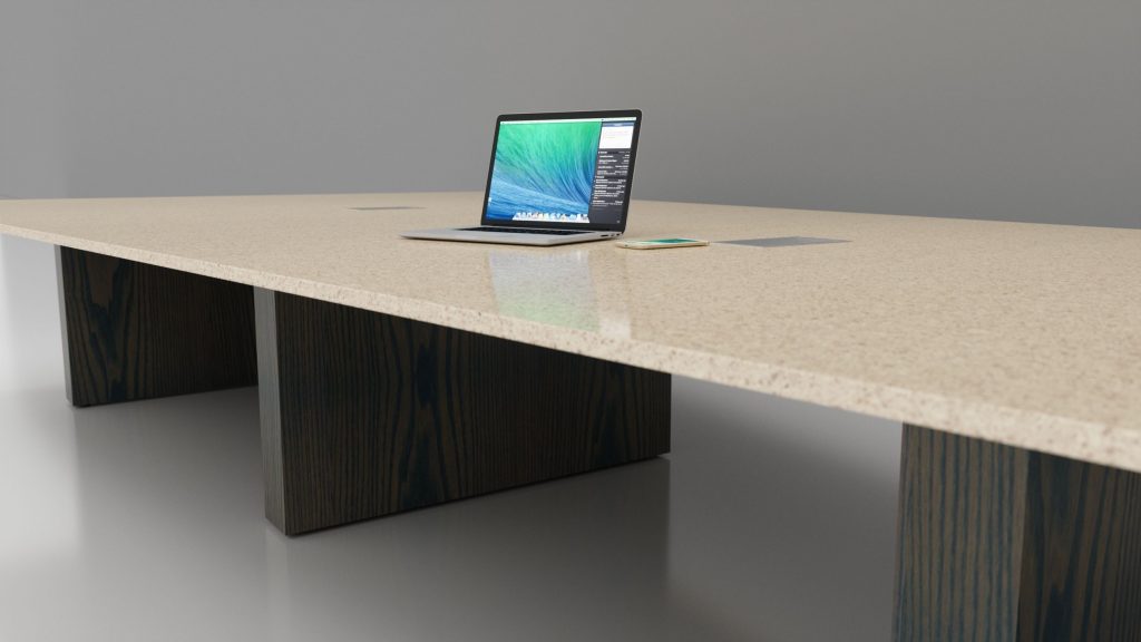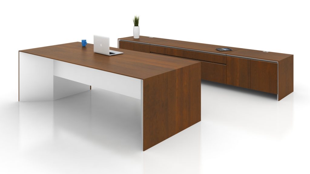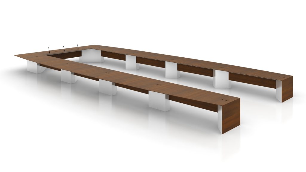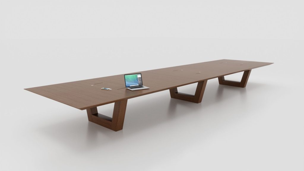 AERO sit-to-stand desk & conference table, bespoke backwall treatment