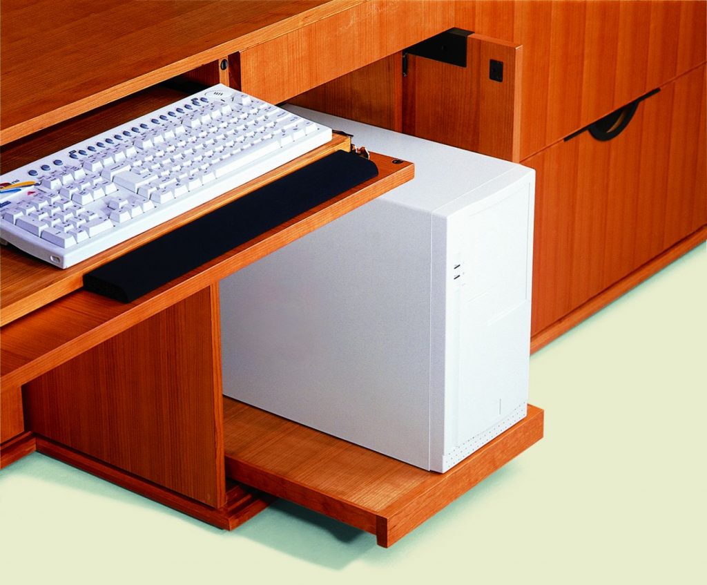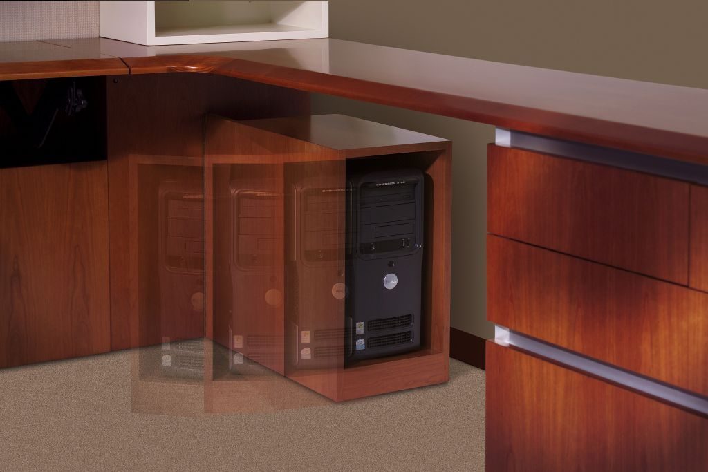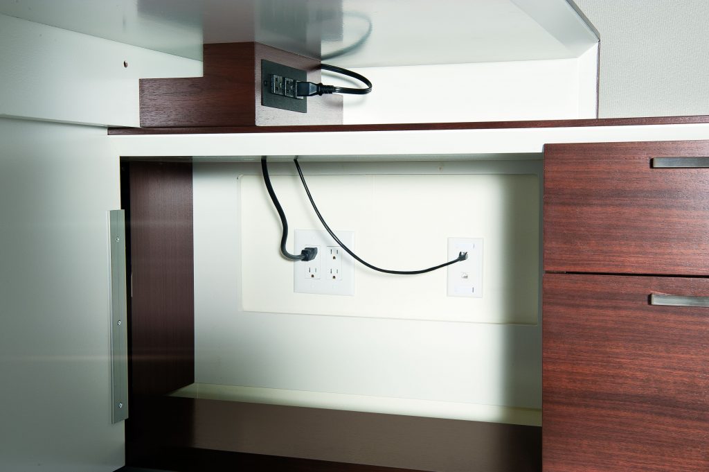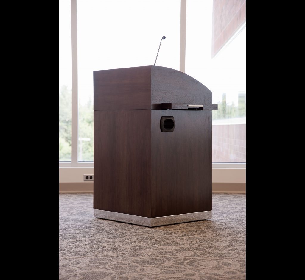 podium w/ built-in microphone, slide out tray, and equipment venting