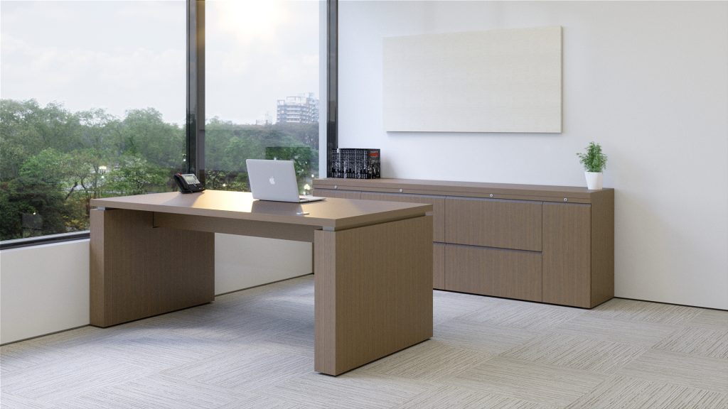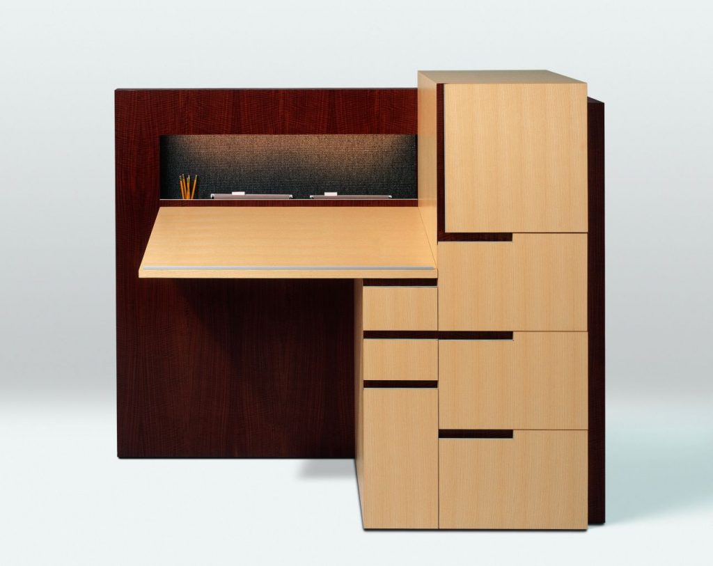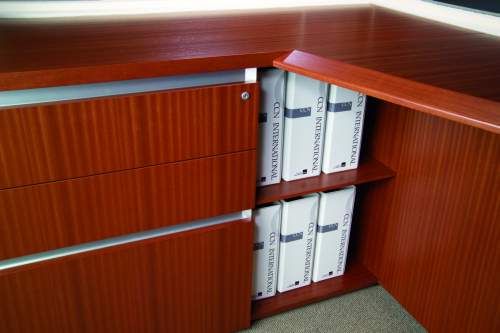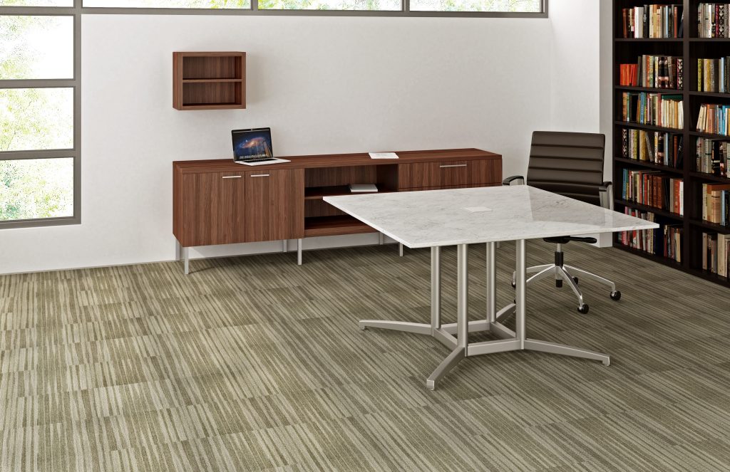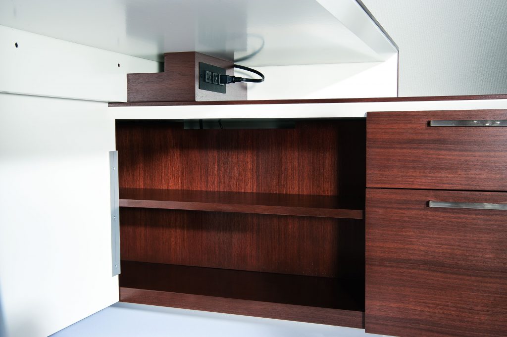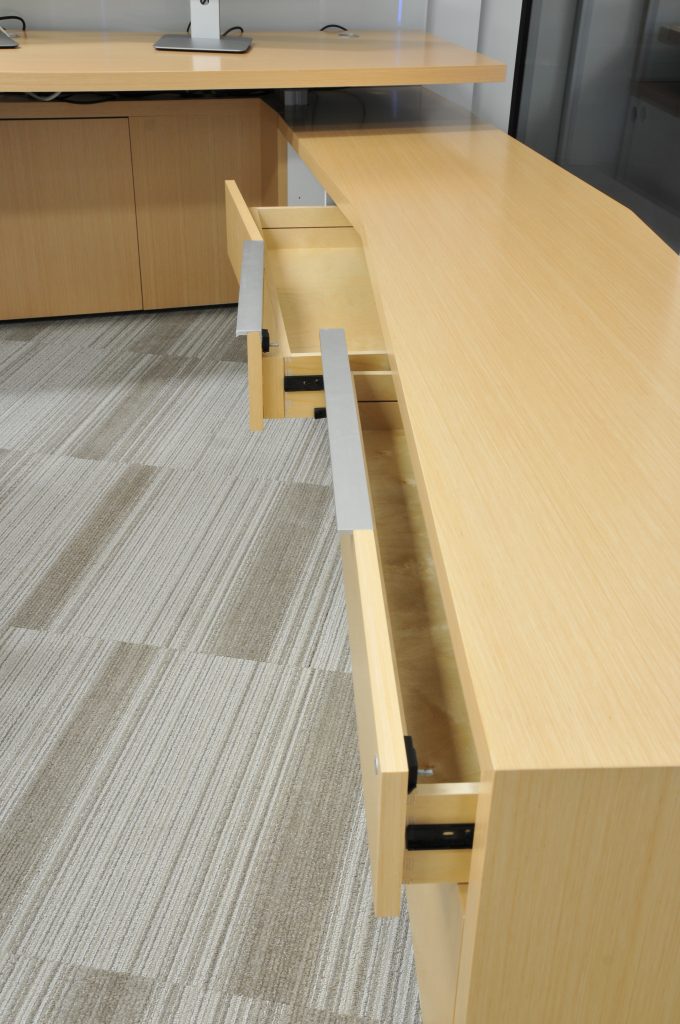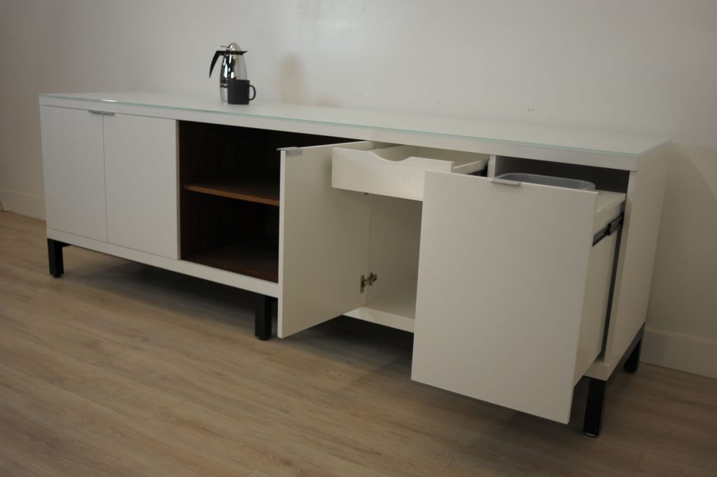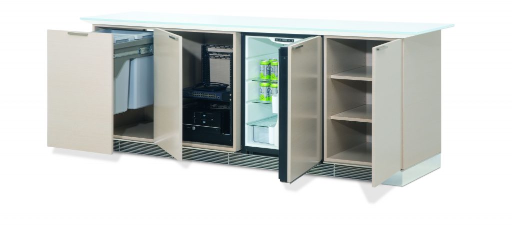 AERO conference credenza w/ waste-recycling bay, AV rack bay, refridgerator bay, and general storage bay